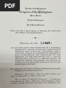 Bayanihan To Heal As One Act RA 11469PDFBayanihan To Heal As One Act RA 11469Added by Kar0 ratingsfunction cn(e,t){var n=e+t;return n<=0?0:Math.round(e/n*100)}% found this document usefulSave Bayanihan To Heal As One Act RA 11469 for later
