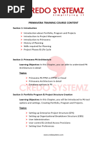 Primavera P6 Course SyllabusPDFPrimavera P6 Course SyllabusAdded by Harsh Patel100% (1)function cn(e,t){var n=e+t;return n<=0?0:Math.round(e/n*100)}% found this document usefulSave Primavera P6 Course Syllabus for later