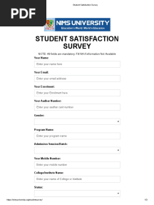 Student Satisfaction Survey PDFPDFStudent Satisfaction Survey PDFAdded by ganesh0 ratingsfunction cn(e,t){var n=e+t;return n<=0?0:Math.round(e/n*100)}% found this document usefulSave Student Satisfaction Survey PDF for later