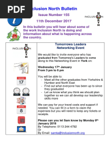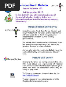 Inclusion North Bulletin: Farewell & UpdatesPDFInclusion North Bulletin: Farewell & UpdatesAdded by Monica0 ratingsfunction cn(e,t){var n=e+t;return n<=0?0:Math.round(e/n*100)}% found this document usefulSave Inclusion North Bulletin: Farewell & Updates for later
