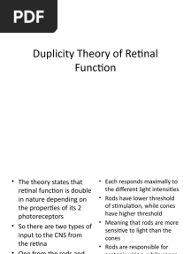 Duplicity Theory of Retinal FunctionPDFDuplicity Theory of Retinal FunctionAdded by Obansa John 0 ratingsfunction cn(e,t){var n=e+t;return n<=0?0:Math.round(e/n*100)}% found this document usefulSave Duplicity Theory of Retinal Function for later