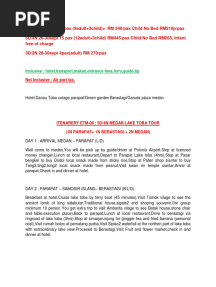 Medan Lake Toba Tour PackagesPDFMedan Lake Toba Tour PackagesAdded by phygo0 ratingsfunction cn(e,t){var n=e+t;return n<=0?0:Math.round(e/n*100)}% found this document usefulSave Medan Lake Toba Tour Packages for later