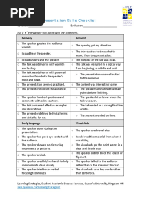 Presentation Skills Checklist: Delivery ContentPDFPresentation Skills Checklist: Delivery ContentAdded by James 0 ratingsfunction cn(e,t){var n=e+t;return n<=0?0:Math.round(e/n*100)}% found this document usefulSave Presentation Skills Checklist: Delivery Content for later