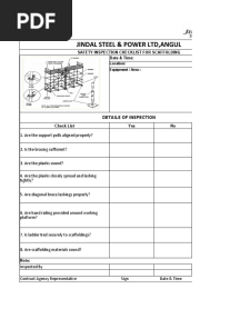 Scaffolding Safety Inspection ChecklistPDFScaffolding Safety Inspection ChecklistAdded by Prajnay Shetty0 ratingsfunction cn(e,t){var n=e+t;return n<=0?0:Math.round(e/n*100)}% found this document usefulSave Scaffolding Safety Inspection Checklist for later