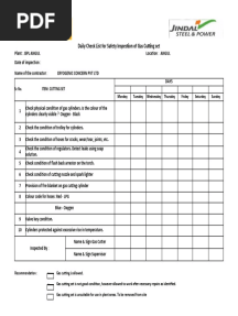 Gas Cutting Set Daily ChecklistPDFGas Cutting Set Daily ChecklistAdded by Prajnay Shetty0 ratingsfunction cn(e,t){var n=e+t;return n<=0?0:Math.round(e/n*100)}% found this document usefulSave Gas Cutting Set Daily Checklist for later