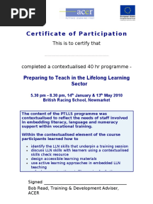 Certificate for PTLLS Training CompletionPDFCertificate for PTLLS Training CompletionAdded by Bob Read0 ratingsfunction cn(e,t){var n=e+t;return n<=0?0:Math.round(e/n*100)}% found this document usefulSave Certificate for PTLLS Training Completion for later